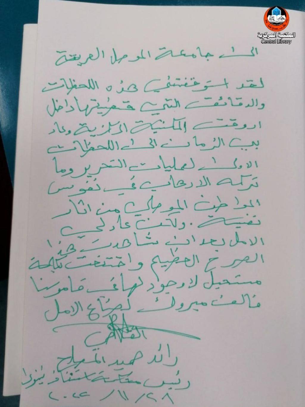 تجسيداً لدور في تعزيز التعاون مع كافة المؤسسات ، استقبل الاستاذ الدكتور قصي الاحمدي رئيس جامعة الموصل القاضي رائد حميد المصلح رئيس محكمة استئناف نينوى والوفد المرافق ، وتحدث السيد رئيس جامعة الموصل والاستاذ سيف الاشقر الامين العام لمكتبات جامعة الموصل خلال الزيارة عن الخدمات التي تقدمها المكتبة بجهود منتسبيها وافراد المجتمع والجهات الداعمة، وقد ابدى السيد رئيس محكمة استئناف نينوى اعجابه بما تم انجازه مؤكداً على اهمية التعاون المستمر لجامعة الموصل ومكتبتها المركزية مع جميع مؤسسات الدولة لضمان تقديم افضل الخدمات للمستفيدين.