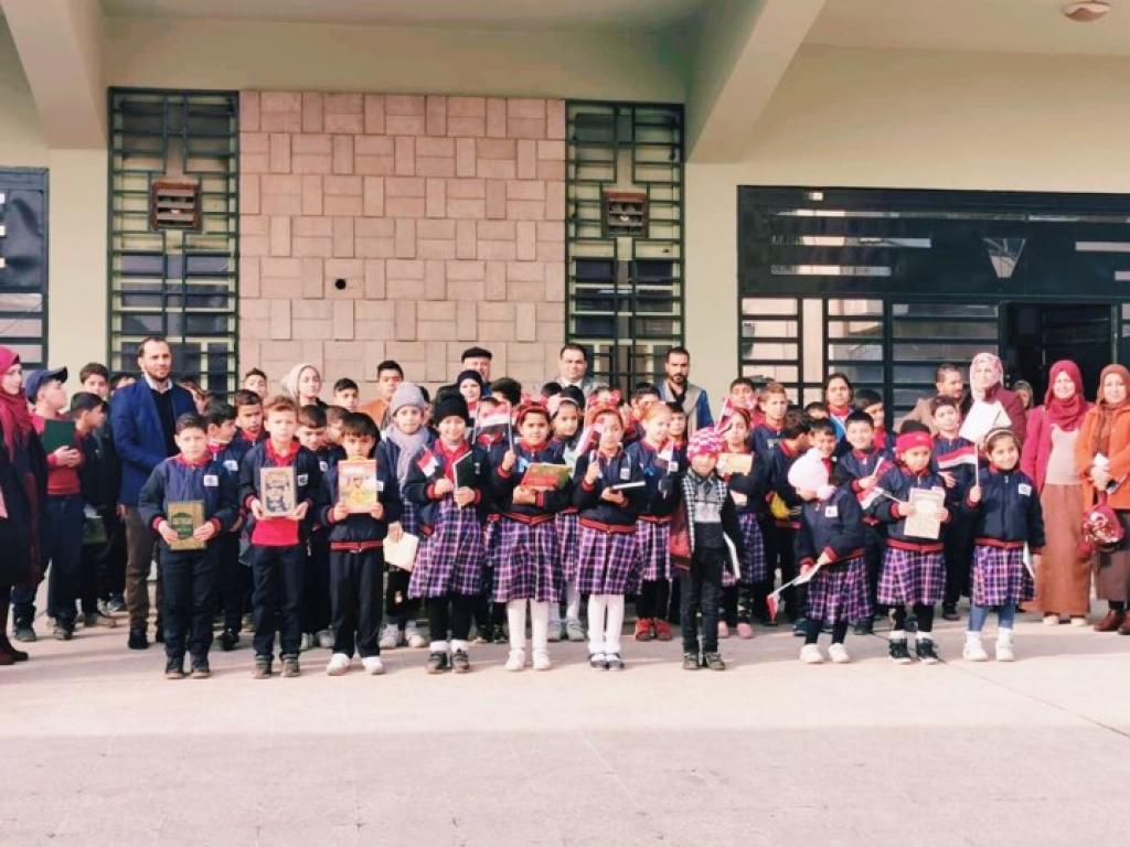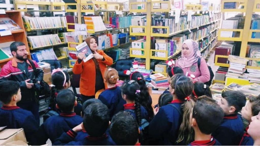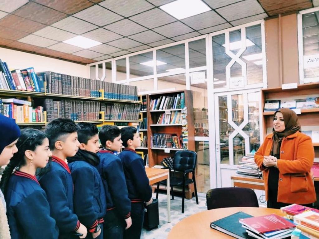 طلبة مدرسة الدر المنثور يهدون كتباً متنوعة للمكتبة اثناء زيارتهم العلمية لها