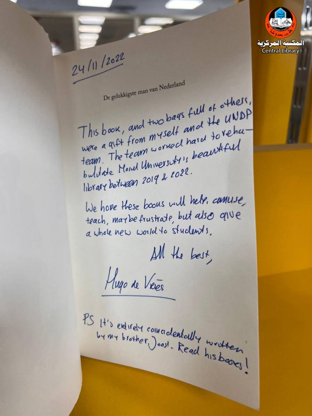 ضمن سعي جامعة الموصل لديمومة التنسيق و التعاون المشترك مابين جامعة الموصل والمنظمات الداعمة، زار فريق برنامج الأمم المتحدة الإنمائي وقد استقبلهم الاستاذ سيف الاشقر الامين العام لمكتبات جامعة الموصل واشار خلال الزيارة الى الخدمات التي تقدمها المكتبة والخطط التي يتم تنفيذها باشراف السيد رئيس جامعة الموصل وبجهود متميزة من كوادر المكتبة، وقدم السيد هيوكو دو فريس بحضور الوفد الزائر بعض الكتب كاهداء للمكتبة من الاصدقاء الهولنديين ومن بين ابرز الكتب التي يعتز بها كتاب من تأليف اخيه السيد يوست، وقد ابدى الوفد الزائر اعجابه بهذا بما تم تحقيقه بالتعاون من فريق برنامج الأمم المتحدة الإنمائي مؤكداً على استمرار التواصل للعمل في مجالات خدمة المجتمع