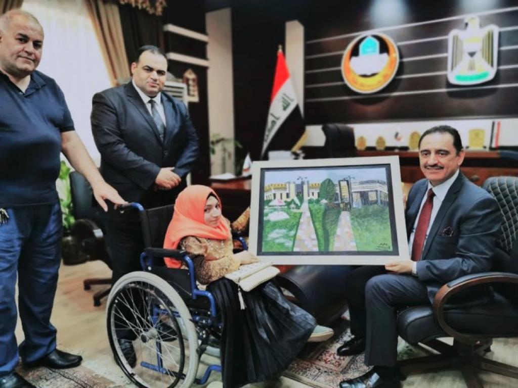 مبدعة تهدي لوحة فنية للمكتبة المركزية في جامعة الموصل