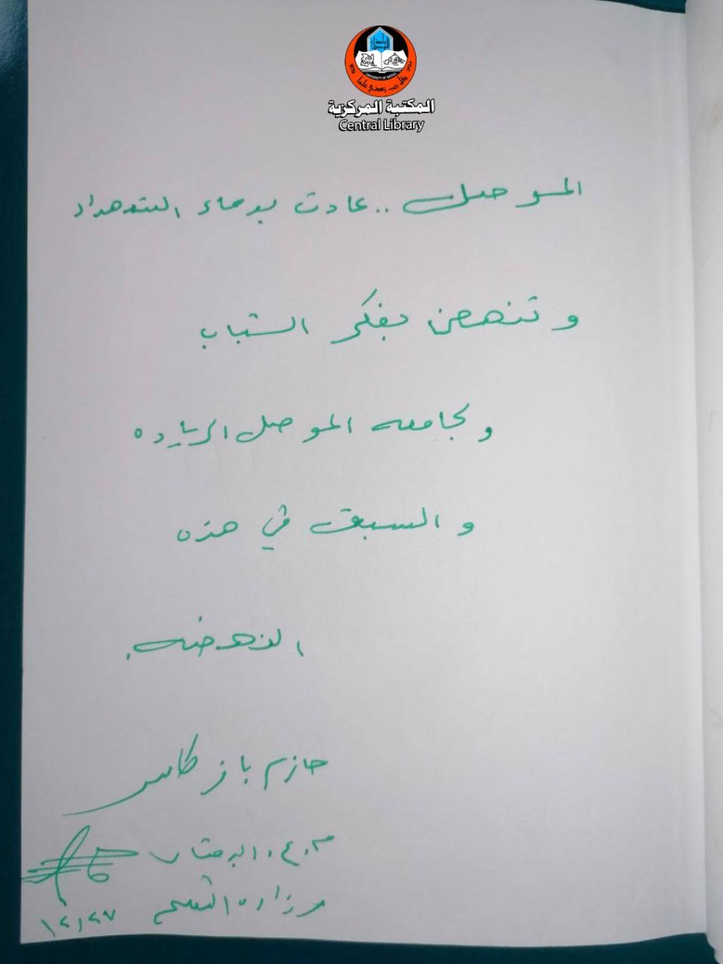 تجسيداً لدور جامعة الموصل في خدمة المجتمع بدعم من وزارة التعليم العالي والبحث العلمي ، استقبل الاستاذ الدكتور قصي الاحمدي رئيس جامعة الموصل الاستاذ الدكتور حازم باقر طاهر مدير عام دائرة البعثات والعلاقات الثقافية في وزارة التعليم العالي والبحث العلمي والدكتور عبد الجليل محمد مجيد مدير قسم العلاقات الثقافية في وزارة التعليم العالي والبحث العلمي وبحضور الاستاذ المساعد الدكتورة ياسمين عبدالكريم عميد كلية الآثار وعدد من مسؤولي الجامعة ، وتحدث السيد رئيس جامعة الموصل والاستاذ سيف الاشقر الامين العام لمكتبات جامعة الموصل خلال الزيارة عن الخدمات التي تقدمها المكتبة بجهود منتسبيها وافراد المجتمع والجهات الداعمة، وقد ابدى السيد مدير عام دائرة البعثات والعلاقات الثقافية في وزارة التعليم العالي والبحث العلمي اعجابه بما تم انجازه مؤكداً على دعم الوزارة المستمر لجامعة الموصل ومكتبتها المركزية لضمان تقديم افضل الخدمات للمستفيدين