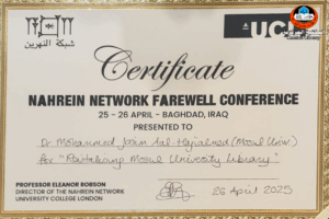 يجدر بالذكر أن شبكة النهرين تواصل دعمها للمكتبة المركزية من خلال تسهيل التعاون مع نخبة من أفضل المتخصصين والخبراء الدوليين في مجال المكتبات والحفاظ على التراث.