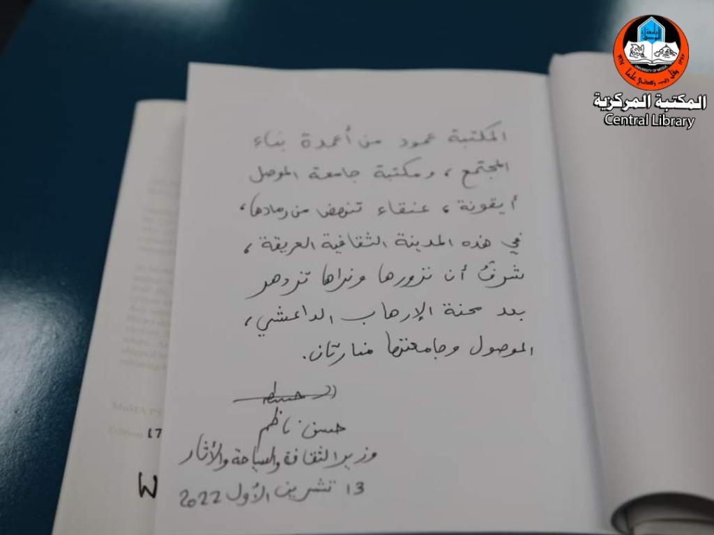 تجسيداً لدور جامعة الموصل في ديمومة التعاون والترحيب بكافة ضيوفها، استقبل الاستاذ الدكتور قصي الاحمدي رئيس جامعة الموصل معالي وزير الثقافة والسياحة والاثار الدكتور حسن ناظم بحضور عدد من مسؤولي الادارات، وتحدث الاستاذ سيف الاشقر الامين العام لمكتبات جامعة الموصل خلال الزيارة عن القاعات ومحتوياتها وكذلك الخدمات التي تقدمها المكتبة بجهود منتسبيها والخطط التي يتم تنفيذها باشراف السيد رئيس جامعة الموصل، وقد ابدى معالي وزير الثقافة والسياحة والاثار اعجابه بهذا الانجاز واشاد بالجهود التي يتم بذلها في مدينة الموصل التي وصفها بالمدينة الثقافية العريقة