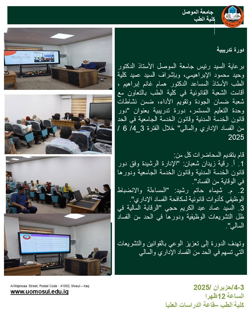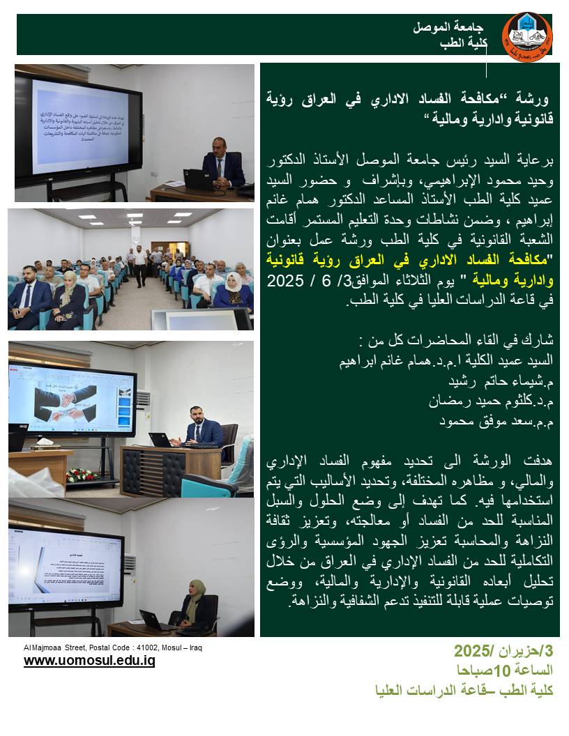 برعاية السيد رئيس جامعة الموصل الأستاذ الدكتور وحيد محمود الإبراهيمي، وإشراف الأستاذ الدكتور همام غانم إبراهيم، ساهمت كلية الطب شعبة الإعلام والاتصال الحكومي ووحدة حقوق [إقرأ المزيد]