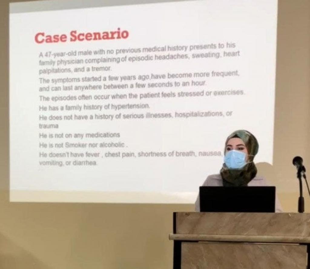 فقد تمّ تقديم السيمنار السابع والعشرين الموسوم Management of Patients with Abnormal Adrenal Function من قبل الطالبات تمارة خالد محمد، وحنين مقداد نعمت، وأسماء عبد محمد، وزهراء محمد خالد، وسارة حمزه حمادي، وبإشراف مقرر الفرع المدرس الدكتور وائل ذنون يونس. وتطرق السيمنار الى كيفية معالجة المرضى المصابين باختلالات الغدة الكظرية.