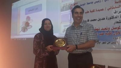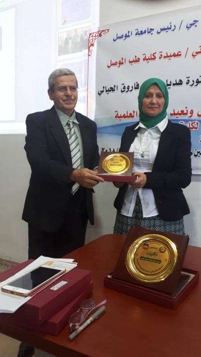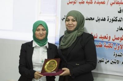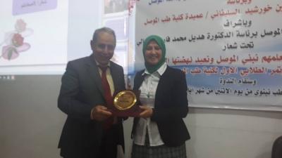 - السيد عامر نجم محمدبعد ذلك، تمّ تقديم دروع من قبل الأستاذ الدكتورة بيبين خورشيد السليفاني إلى كل منالأستاذ المساعد الدكتورة هديل محمد فاروق الحيالي/ رئيس فرع الأشعة، وإلىالسيد أنور محسن الحمداني/ مدير الإدارة،وذلك لتفانيهما وإخلاصهما في عملهما.بعد فقرة التكريم، ابتدأت أعمال الجلسة العلمية الطلابية، حيث ترأسها الدكتور سمير عبداللطيف، وبمقررية الدكتورة داليا الفلكي. قدّم طلاب المرحلة الخامسة تسعةَ بحوث علمية في مواضيع الأشعة نالت استحسان الحاضرين. وكان يعقب كل محاضرة مناقشات واستيضاحات من قبل الأستاذة الحاضرين وُجِّهَتْ إلى الطلبة مقدمي هذه المحاضرات. هذا، ويأتي انعقاد هذا المؤتمر من أجل الارتقاء بمستوى التعليم في كلية الطب، وذلك من خلال حث الطلبة على كيفية كتابة البحوث العلمية، وتعليمهم أسلوب الإلقاء العلمي الصحيح، مستفيدينَ من ثقافة أساتذتهم وخبرتهم في هذا الميدان. لمزيد من التفاصيل انقر هنا.