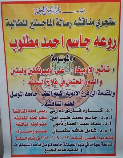 إعلان عن مناقشة رسالة ماجستير فرع علم الأدوية كلية الطب جامعة الموصل