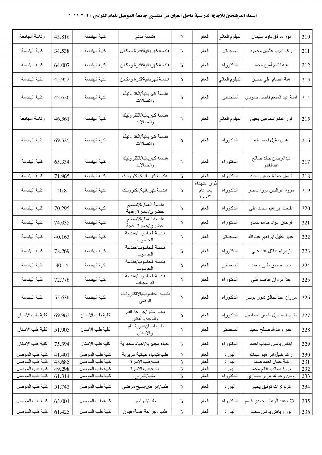 الإعلان عن نتائج التقديم الأولية للإجازات الدراسية داخل العراق للعام الدراسي 2020 – 2021 لمنتسبي كلية الطب جامعة الموصل