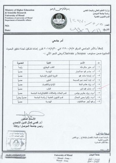 صَدَرَ في جامعة الموصل الأمر الجامعي الذي تقرّر بموجبه إعادة تشكيل لجنة تدقيق البحوث المنشورة ضمن مستوعب سكوبس وكلارفيت، وذلك في 16 حزيران 2019. وتتألف اللجنة المعاد تشكيلها من السيد عميد كلية الطب البيطري جامعة الموصل الأستاذ الدكتور منير سالم طه (رئيساً)، وبعضوية ثمانية آخرين، من بينهم السيد عميد كلية الطب جامعة الموصل الأستاذ الدكتور باسل محمد نذير سعيد.. كل التوفيق والنجاح للجنة في اداء عملها على الوجه الأكمل والأمثل إن شاء الله.