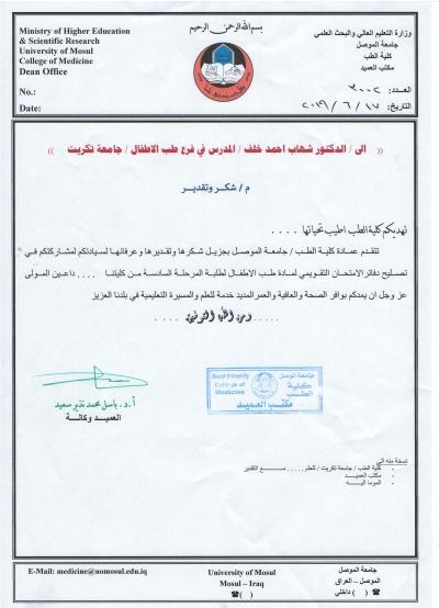 زار السيدُ عميد كلية الطب جامعة الموصل الأستاذ الدكتور باسل محمد نذير سعيد (رئيسُ لجنة الامتحان التقويمي) لجنةَ تصحيح مادة طب الأطفال (المرحلة السادسة) للعام الدراسي 2018 – 2019 في كليات الطب لجامعات الموصل وكركوك وتكريت ونينوى، وذلك يوم الاثنين 17 حزيران 2019. وكان في قاعة التصحيح كل من السيد عضو اللجنة الأستاذ المساعد الدكتور ربيع ياسن الدبوني (تدريسي فرع طب الأطفال كلية الطب جامعة الموصل)، والمدرس الدكتور شهاب أحمد (كلية الطب جامعة تكريت)، فضلاً عن تدريسيي طب الأطفال كلية الطب لجامعتي الموصل ونينوى. وأبدى السيد العميد توجيهاته بخصوص التصحيح وآلياته من أجل الانتهاء منه على أكمل صورة.وفي سياق متصل، وجّهت عمادةُ كلية الطب جامعة الموصل كتابَ شكر وتقدير للمدرس الدكتور شهاب أحمد (كلية الطب جامعة تكريت). ويأتي توجيه كتاب الشكر والتقدير هذا تقديراً وعرفاناً لمشاركة المومأ إليه في تصليح دفاتر الامتحان التقويمي المشار إليه أعلاه.