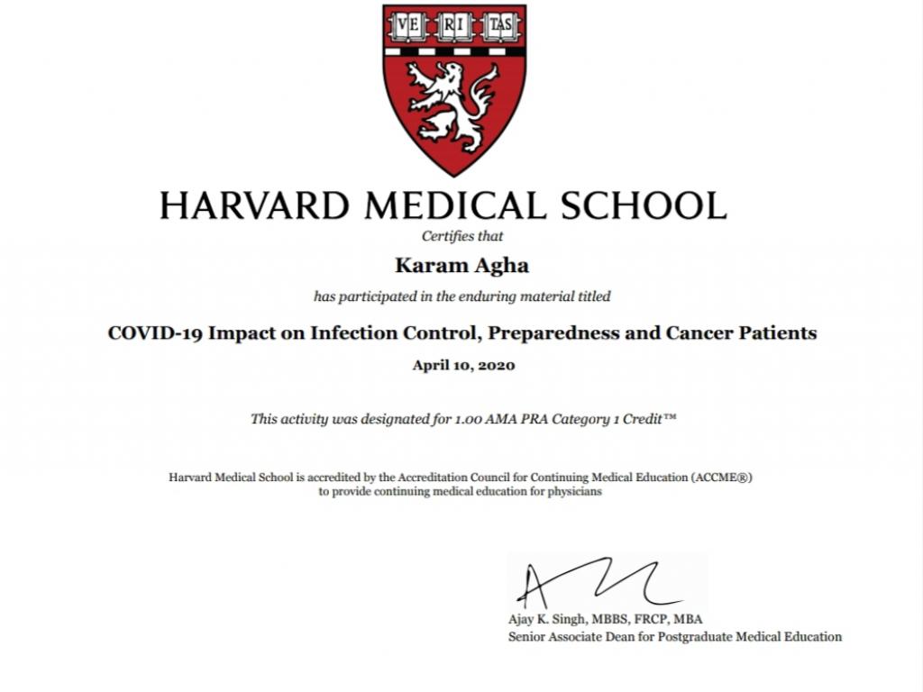 السيد مقرر فرع علم الأمراض كلية الطب جامعة الموصل يحصل على شهادتين من جامعة هارفارد حول كورونا