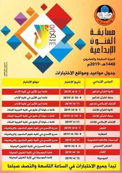 أعلنت اللجنة المركزية العليا لمسابقة الفنون الابداعية في جامعة الموصل للدورة السابعة والعشرين لسنة 2019 عن المواعيد الزمانية والمكانية للمسابقة. وجاء في المنشور المعلن عن ذلك أن انطلاق الاختبارات جميعها سيبدأ في الساعة التاسعة والنصف صباحاً إزاء كل جنس من أجناس هذه المسابقة.