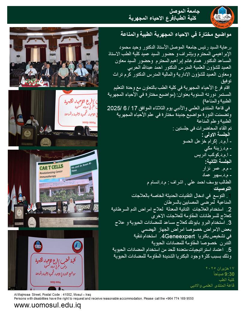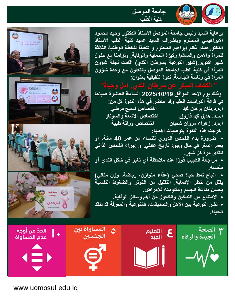 برعاية السيد رئيس جامعة الموصل الاستاذ الدكتور وحيد محمود الابراهيمي وبإشراف السيد عميد كلية الطب الاستاذ المساعد الدكتور همام غانم ابراهيم و تنفيذأ للخطة الوطنية [إقرأ المزيد]