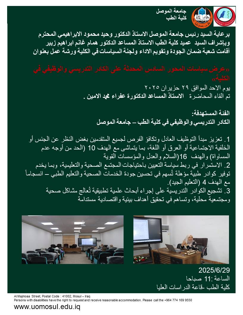 ورشة فرع الطب - كلية الطب / جامعة الموصل برعاية السيد رئيس جامعة الموصل الأستاذ الدكتور وحيد محمود الإبراهيمي، وبإشراف الأستاذ الدكتور همام غانم إبراهيم [إقرأ المزيد]