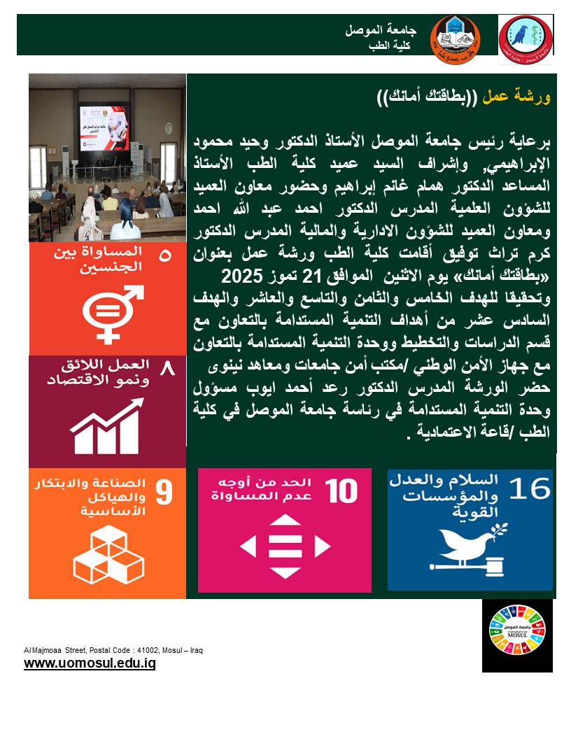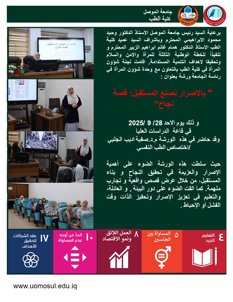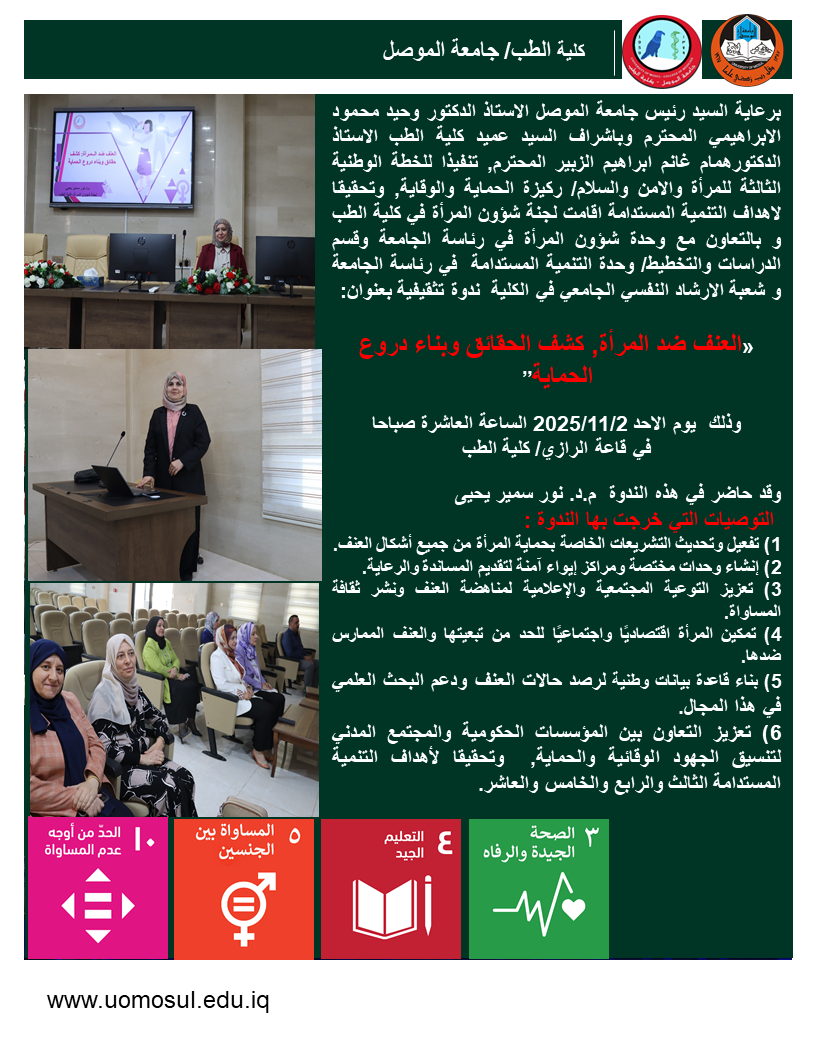 ورشة عمل / لجنة شؤون المرأة - كلية الطب بعنوان (الابتزاز الإلكتروني: الوقاية والتصدي بوعي وأمان ) برعاية السيد رئيس جامعة الموصل الأستاذ الدكتور [إقرأ المزيد]