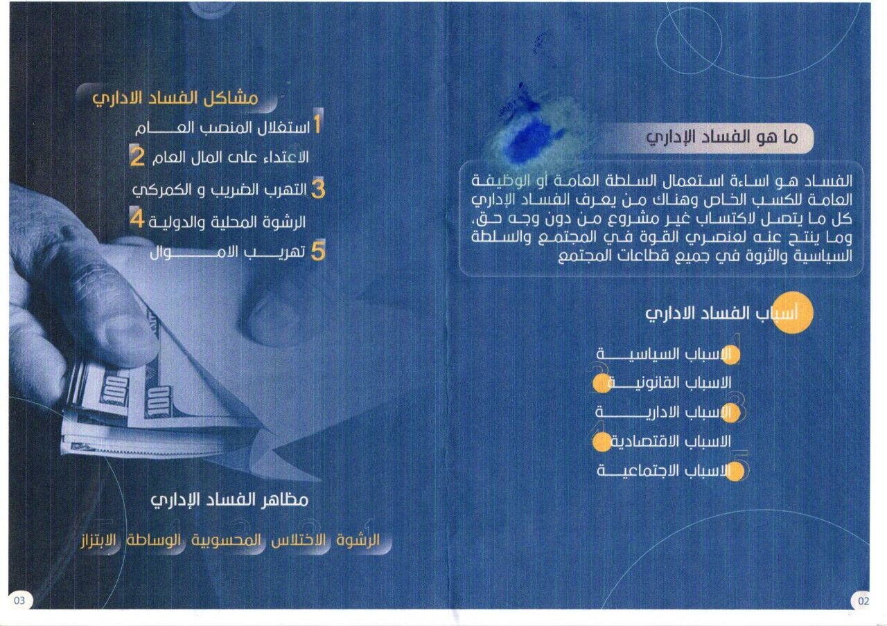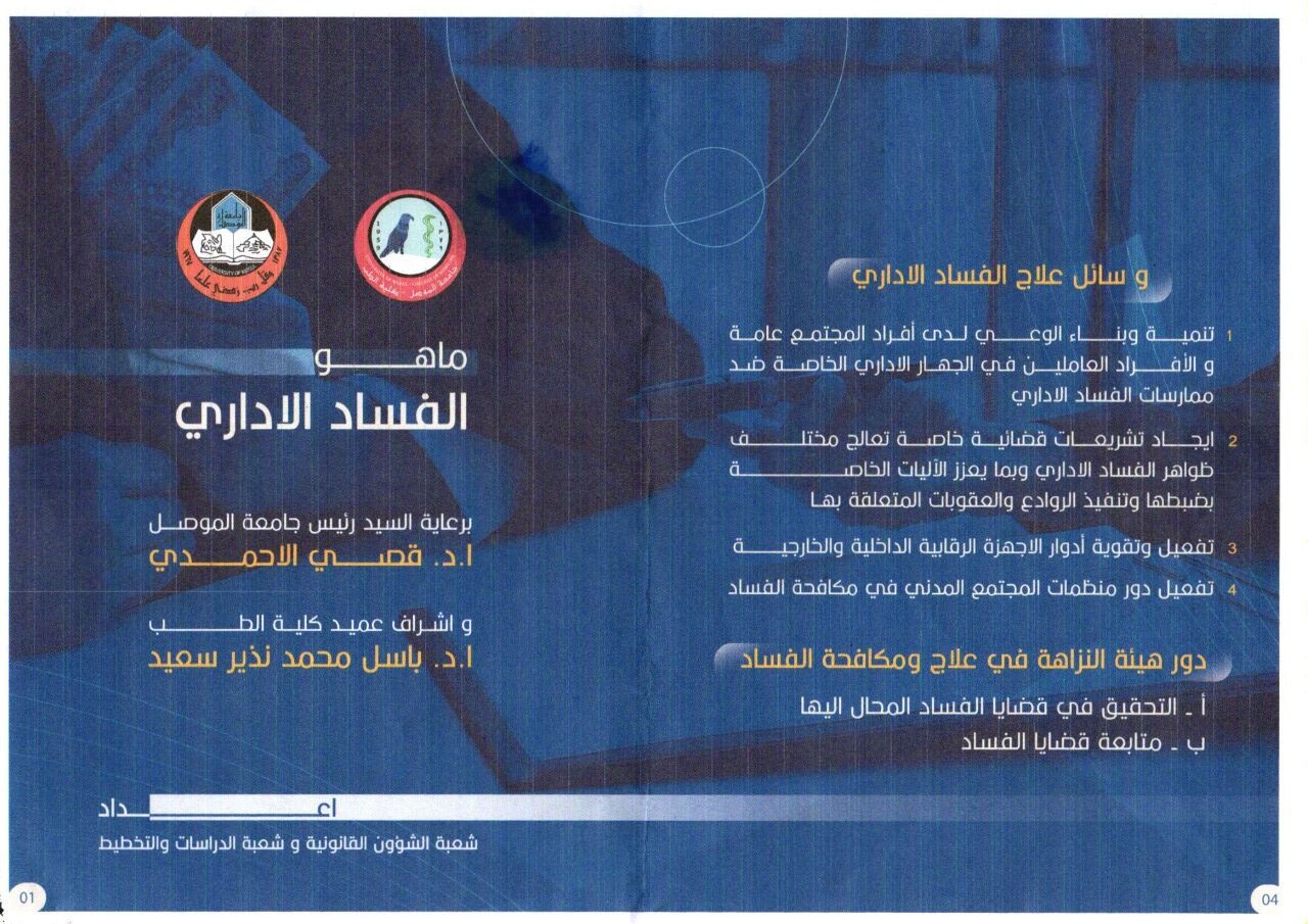 برعاية السيد رئيس جامعة الموصل الاستاذ الدكتور قصي الاحمدي وباشراف الاستاذ الدكتور باسل محمد نذير سعيد قامت شعبة الشؤون القانونية باعداد بروشور بعنوان ماهو الفساد الاداري