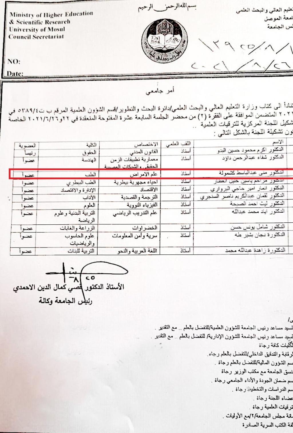 تكليف تدريسية فرع علم الأمراض كلية الطب جامعة الموصل عضوةً للّجنة المركزية للترقيات
