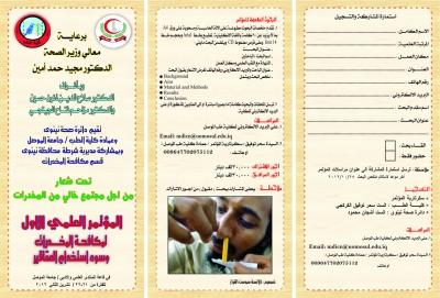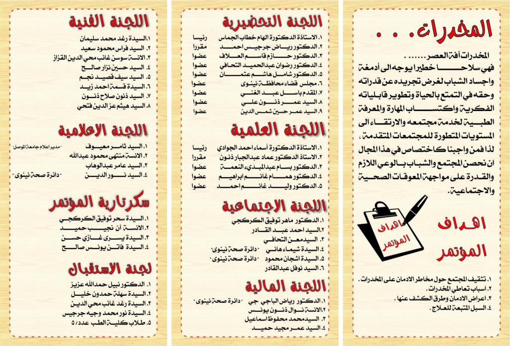 ننوه الى ان المؤتمر العلمي الاول لمكافحة المخدرات وسوء استخدام العقاقير قد تأجل موعد انعقاده الى يوم الاربعاء الموافق 21 – 22 تشرين الثاني 2012 وسيقام في قاعة المنتدى العلمي والادبي في رحاب جامعة الموصل والى ذلك نسترعي انتباه السادة الراغبين بالمشاركة او الحضور .