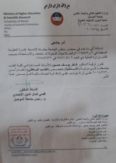 تهنئة عمادة كلية الطب جامعة الموصل إلى تدريسي فرع الطب لمناسبة حصوله على لقب الأستاذية
