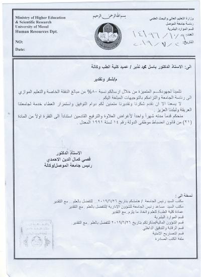 حصول السيد عميد كلية الطب جامعة الموصل على كتاب شكر وتقدير من لدن السيد رئيس جامعة الموصل