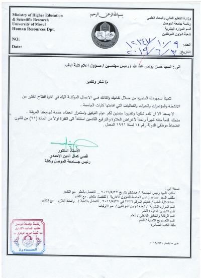 حصول السيد مسؤول إعلام كلية الطب جامعة الموصل على كتاب شكر وتقدير من لدن السيد رئيس جامعة الموصل
