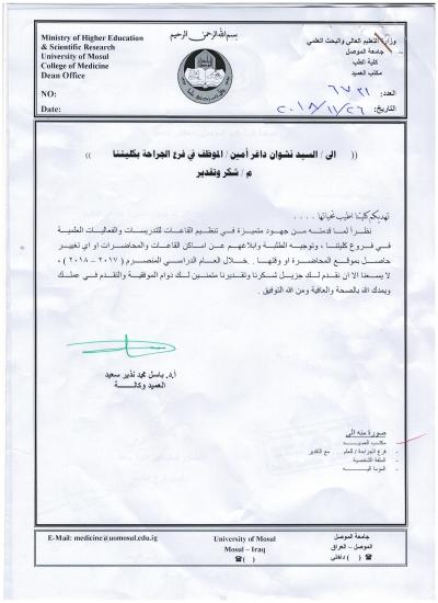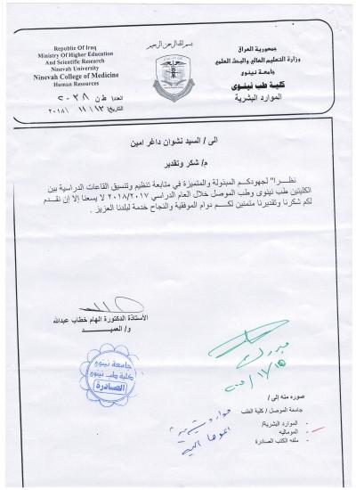 حصول السيد نشوان داغر أمين على كتابي شكر وتقدير من عمادتي كليتي طب الموصل ونينوى