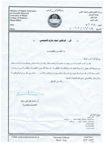 حصول المدرس الدكتور أمجد حازم عبد على كتاب شكر وتقدير من عمادة كلية الطب جامعة الموصل