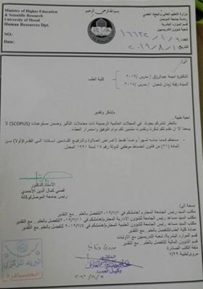 حصلت كل من السيدة مسؤولة شعبة البعثات والعلاقات الثقافية (تدريسية فرع طب الأسرة والمجتمع) كلية الطب جامعة الموصل المدرس الدكتورة أميمة عبدالرزاق زبير، والسيدة تدريسية وحدة الحاسبات كلية الطب جامعة الموصل الأستاذ المساعد رقية زيدان شعبان على كتاب شكر وتقدير من لدن السيد رئيس الجامعة، وذلك بتاريخ 1 آب 2019. ويأتي توجيه كتاب الشكر والتقدير هذا عطفاً على نشر بحوثهما العلمية في مجلات عالمية رصينة ذات معامل تأثير Impact Factorوذات مستوعب سكوبس SCOPUS. مبارك للمومأ إليهما هذا التألق والعطاء خدمةً للمسيرة العلمية لكليتنا وجامعتنا.