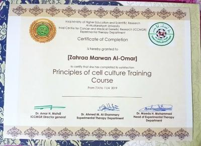 حضرت المدرس الدكتورة زهراء مروان شعبان تدريسية فرع علم الأمراض كلية الطب جامعة الموصل دورتين تدريبيتين في الجامعة المستنصرية ببغداد، وذلك خلال شهر نيسان 2019. فقد حضرت التدريسية المذكورة دورتين تدريبيتين أقامهما المركز العراقي لبحوث السرطان والوراثة الطبية/ قسم العلاج التجريبي التابع للجامعة المستنصرية. الدورة الأولى هي عن أساسيات الزراعة النسيجية Principles of Cell Culture Training Course، وذلك للفترة من 7 – 11 نيسان 2019. وشملت الدورة محاضرات نظرية وتطبيقات عملية للزراعة النسيجية. بينما كانت الدورة الثانية حول استخدام تقنية الوقت الحقيقي للـ بي سي آر Principles of Real – Time PCR Workshop، وذلك للفترة من 14 – 18 نيسان 2019. وتضمنت الدورة الثانية دراسة وتحديد تعبير الجينات في الخلايا. هذا، وقد أٌقيمت الدورتان أعلاه في القاعة الرئيسية للمركز العراقي لبحوث السرطان وكذلك في مختبرات القسم. مبارك للدكتورة زهراء هذا التواصل العلمي الطبي التقني لاستدامة زخم المعلومات خدمةً لفرع علم الأمراض وللكلية عموماً.
