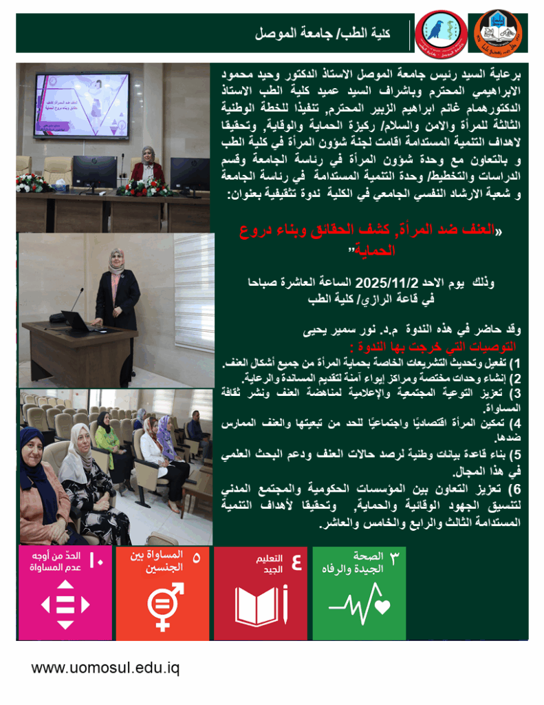 بالتعاون مع قسم الدراسات والتخطيط/ وحدة التنمية المستدامة في رئاسة الجامعة، أقام فرع علم الأمراض في كلية الطب / جامعة الموصل حلقات نقاشية علمية يوم الاحد الموافق ٢ تشرين الثاني ٢٠٢٥ وتناولت مناقشة حالات مرضية متنوعة. تضمنت المواضيع مهمة مثل التحول النسيجي، الخُراج، التخثر المنتشر داخل الأوعية، الداء النشواني، والتليّف الكيسي.