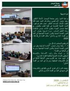 برعاية السيد رئيس جامعة الموصل الأستاذ الدكتور وحيد محمود الإبراهيمي، وبإشراف السيد عميد كلية الطب الأستاذ المساعد الدكتور همام غانم إبراهيم ، أقامت الشعبة القانونية في كلية الطب بالتعاون مع شعبة ضمان الجودة وتقويم الأداء، ضمن نشاطات وحدة التعليم المستمر، دورة تدريبية بعنوان “دور قانون الخدمة المدنية وقانون الخدمة الجامعية في الحد من الفساد الإداري والمالي” خلال الفترة 3_4/ 6 / 2025 تحقيقا للهدف السادس عشر من اهداف التنمية المستدامة “السلام والعدل والمؤسسات القوية ”