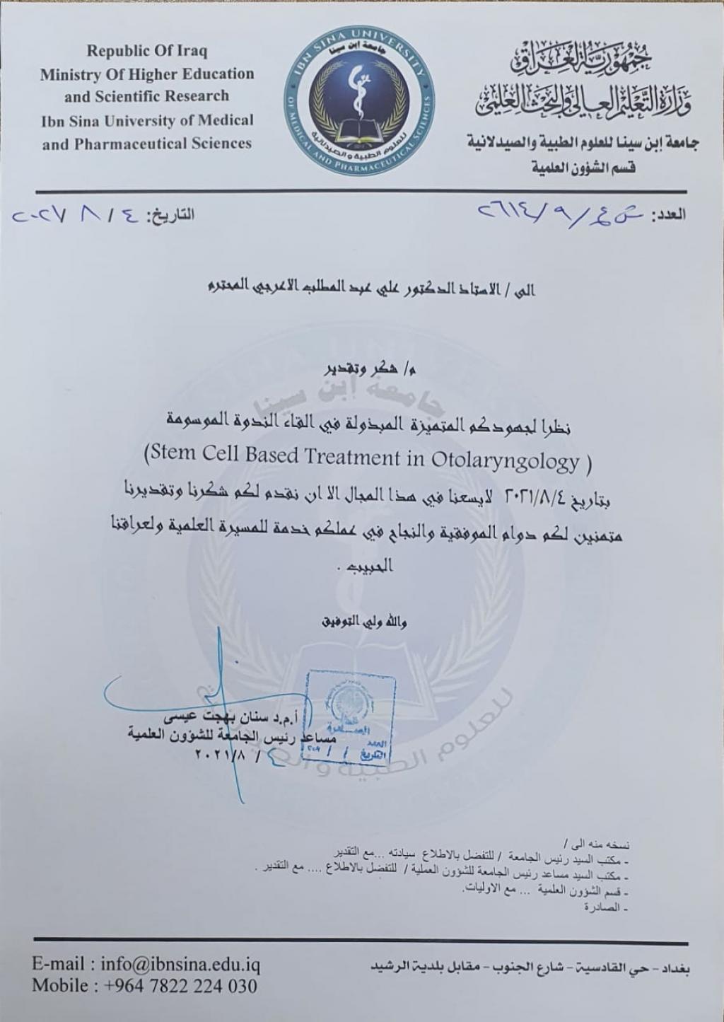 وجّهت رئاسةُ جامعة ابن سينا للعلوم الطبية والصيدلانية كتابَ شكر وتقدير إلى تدريسي فرع الجراحة كلية الطب جامعة الموصل الأستاذ الدكتور علي عبدالمطلب محمد، وذلك بتاريخ 4 آب 2021. ويأتي توجيه كتاب الشكر والتقدير هذا عطفاً على تقديم المحاضرة الافتراضية في الجامعة المذكورة عن استخدام الخلايا الجذعية في علاج أمراض الأنف والاذن والحنجرة. مبارك للمومأ إليه متمنينَ له دوام التألق والتوفيق إنْ شاءَ الله.