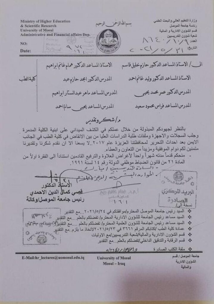 رئاسة جامعة الموصل ومجلس وعمادة كلية الطب يشاركون الطلبة الخريجين فرحتهم بصورة التخرج للعام الدراسي 2020 – 2021