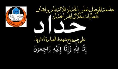 بسم الله الرحمن الرحيموَبَشِرْآالصَابِريْنَ الَّذِينَ إِذا أصَابَتْهُم مُصَيبَةٌ قَالُوا إِنا لِلَّهَ وَإنَّا إِلَيْهِ رَاجِعُونصَدَقَ آللَّهُ آلعَظيْمتضامنا مع عوائل شهداء العبارة من ابناء مدينة الموصل الجريحة وشعبها الصابر على المصاب الجلل الذي حدث عصر يوم الخميس 21 آذار 2019 والذي اودى بحياة مئة شخص من الابرياء من مدينتنا الحبيبة.. يعلن السيد رئيس جامعة الموصل الاستاذ الدكتور قصي كمال الدين الاحمدي وبالنيابة عن منتسبيه من التدريسيين والموظفين والطلبة عن الحداد ثلاثة ايام ووقفة مع قراءة سورة الفاتحة ترحما على ارواح الضحايا في عموم الجامعة وايقاف الفعاليات كافة خلال ايام الحِداد، وذلك في تمام الساعة التاسعة من صباح يوم الاحد 24 اذار 2019.. سائلين الباري عز وجل ان يرحم الشهداء برحمته الواسعة ويدخلهم فسيح جناته والشفاء العاجل للجرحى وان يصبر اهلهم وذويهم ويلهمهم الصبر والسلوان وانا لله وانا اليه راجعون.