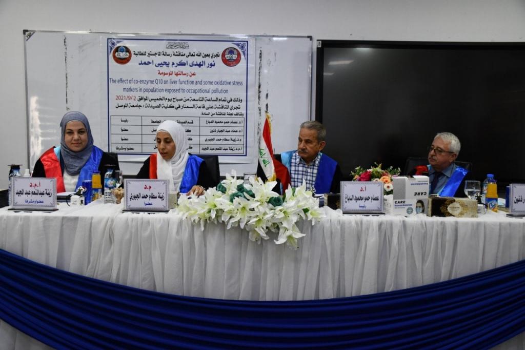 نوقشت في كلية الصيدلة جامعة الموصل رسالةُ الماجستير التي تقدمت بها الطالبة نور الهدى اكرم عن تأثيرات مساعدات الانزيم Q10 على وظائف الكبد، وذلك يوم الخميس 2 أيلول 2021. ترأس لجنة المناقشة الاستاذ الدكتور عصام حمو الدباغ، وعضوية رئيس فرع علم الأدوية كلية الطب جامعة الموصل الأستاذ الدكتور عماد عبدالجبار ذنون، وبمعية عدد من التدريسيين الآخرين.