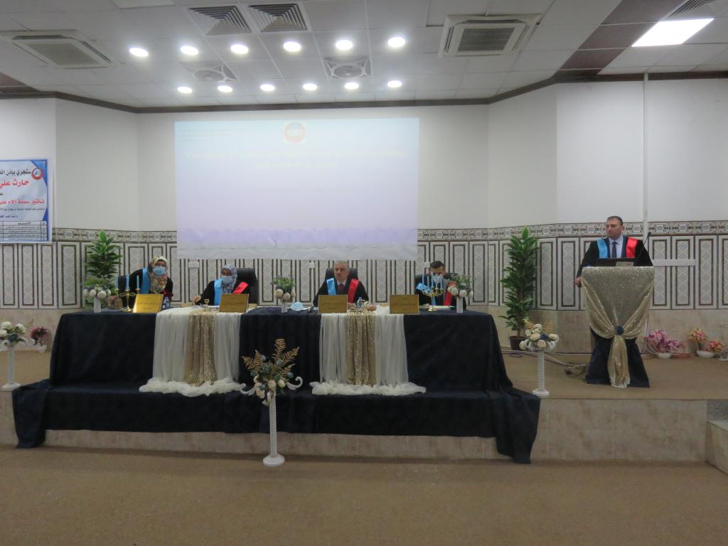 تألفت لجنة المناقشة من الأستاذ المساعد الدكتور احسان محمود المولى (رئيساً)، والأستاذ المساعد الدكتورة رائدة محمد الوزان (عضواً)، والمدرس الدكتور عمر رياض حمدي (عضواً)، والأستاذ المساعد الدكتورة لمى ابراهيم العلاف (عضواً ومشرفاً).