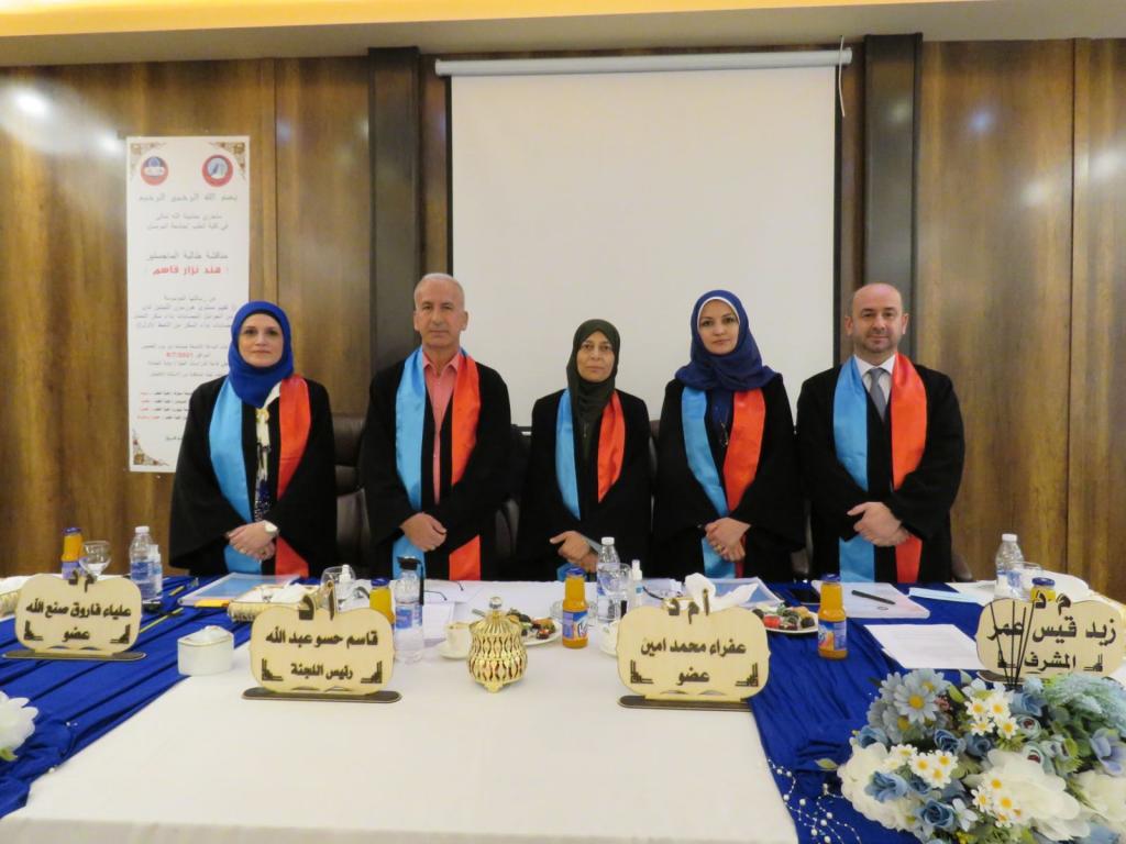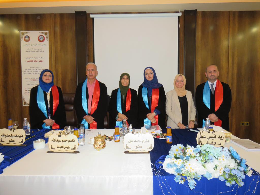 تألفت لجنة المناقشة من الأستاذ الدكتور قاسم حسو عبدالله (رئيساً)، والأستاذ المساعد الدكتورة عفراء محمد أمين (عضواً)، والمدرس الدكتورة علياء فاروق صنع الله (عضواً)، والمدرس الدكتور زيد قيس عمر (عضواً ومشرفاً).
