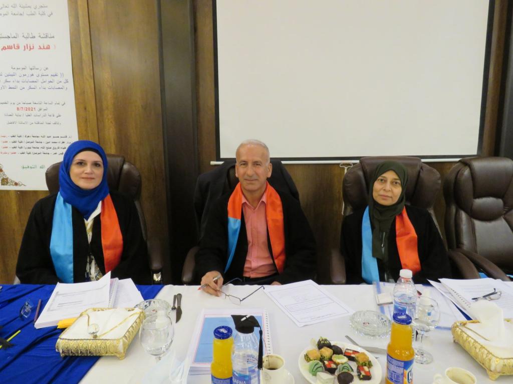 ناقشت رسالة ماجستير لفرع الفسلجة الطبية كلية الطب جامعة الموصل مستوى هورمون الليبتين في النساء الحوامل المصابات بداء سكري الحمل والنساء الحوامل المصابات بداء السكري من النوع الاول وعلاقته بمستوى السي بيبتايد وهورمون الانسولين ومؤشر كتلة الجسم وكذلك علاقته بمستوى الدهون في الدم، والتي تقدّمت بها الطالبة هند نزار قاسم، وذلك يوم الخميس 8 تموز 2021.