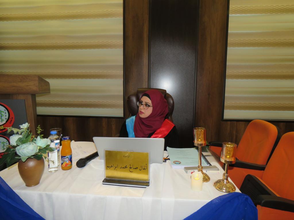 تألفت لجنة المناقشة من الأستاذ الدكتورة منى عبدالباسط كشمولة (رئيساً)، والأستاذ المساعد الدكتور احسان محمود المولى (عضواً)، والأستاذ المساعد الدكتورة اخلاص احمد علي (عضواً)، والأستاذ المساعد سناء محمد طيب (عضواً ومشرفاً).