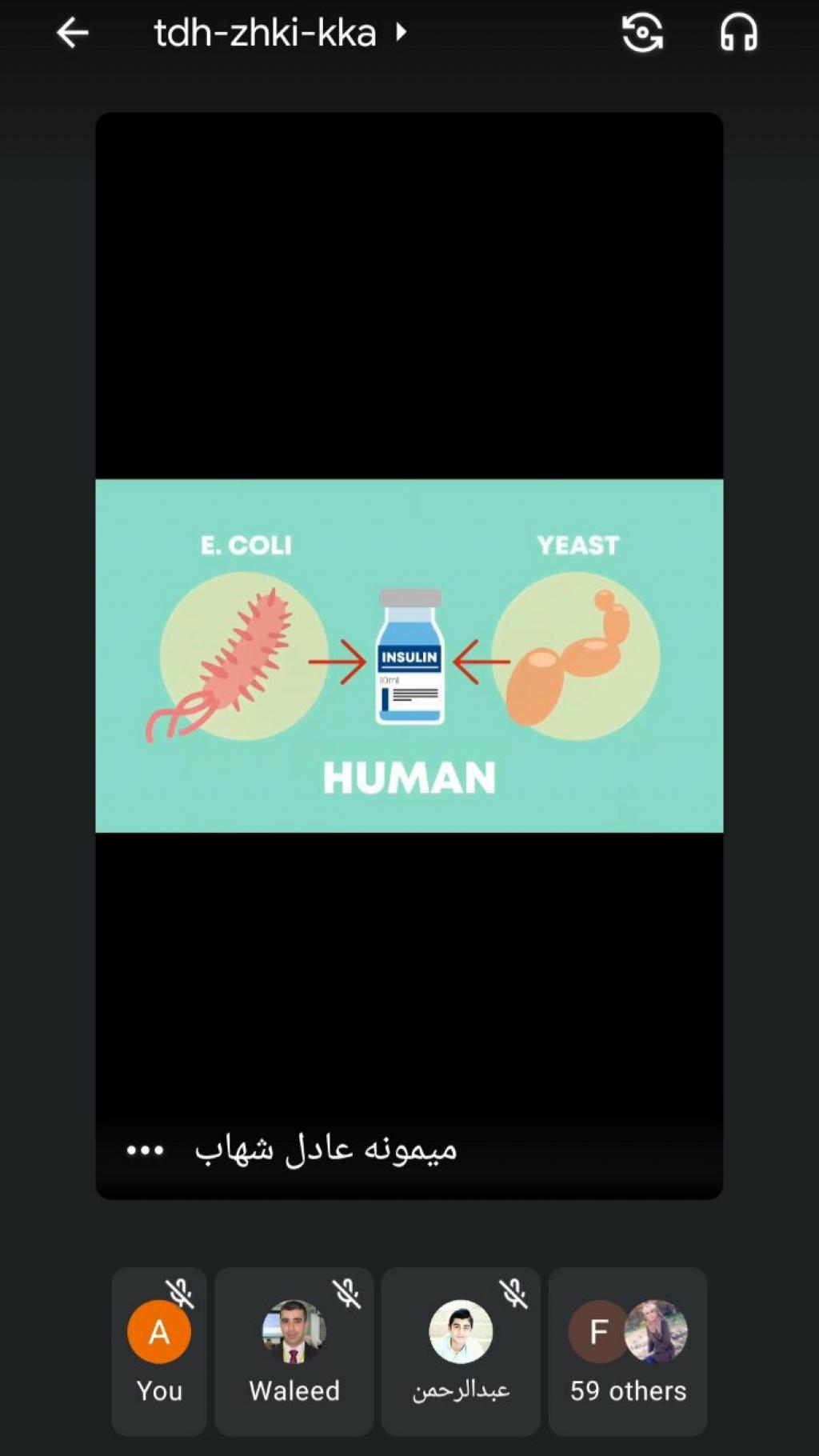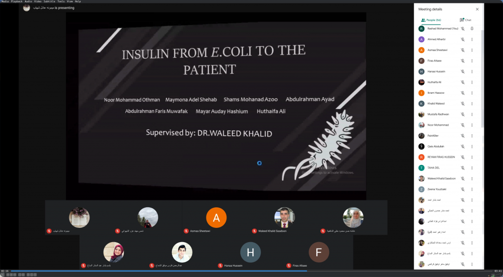 بعد ذلك، قدّم الطلاب عبدالرحمن أياد، وشمس مهند، وعبدالرحمن فارس، وميار عدي، ونور محمد، وحذيفة علي، وميمونة عادل السيمنار الموسوم . Insulin from E.coli to the patientنوقش فيه استخدام تقنيات الهندسة الجينية لإنتاج الانسولين من بكتريا القولون ليكون بديلاً ناجحاً لمرضى السكري الذين يعانون من حساسية تجاه الانسولين ذات المصدر الحيواني. وحظي هذا الموضوع وطريقة عرضه بإعجاب وإشادة من لدن رئاسة الفرع. وأشرف على كلا السيمنارين مقررُ الفرع المدرس المساعد وليد خالد سعدون.