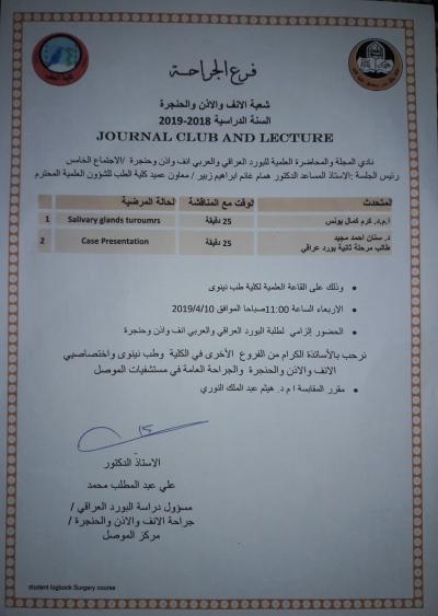 شعبة الأنف والأذن والحنجرة فرع الجراحة كلية الطب جامعة الموصل تدعوكم لحضور الاجتماع الخامس مع نادي المجلة