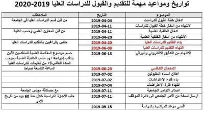 أكد السيد مسؤول شعبة الدراسات العليا كلية الطب جامعة الموصل المدرس الدكتور خالد وليد تركي على صحة التواريخ والمواعيد المهمة للتقديم والقبول للدراسات العليا للعام الدراسي 2019 – 2020، أهمها أنّ فترة التقديم تبدأ من يوم السبت 20 نيسان 2019 لغاية يوم الاثنين 3 حزيران 2019، على أن يكون موعد الامتحان التنافسي يوم الأحد 23 حزيران 2019 …الخ. ويسر الموقع الإلكتروني للكلية نشر المواعيد التفصيلية ليكون المتقدمون للدراسات العليا على اطلاعٍ تام بها، ووفق الجدول المنشور أدناه.