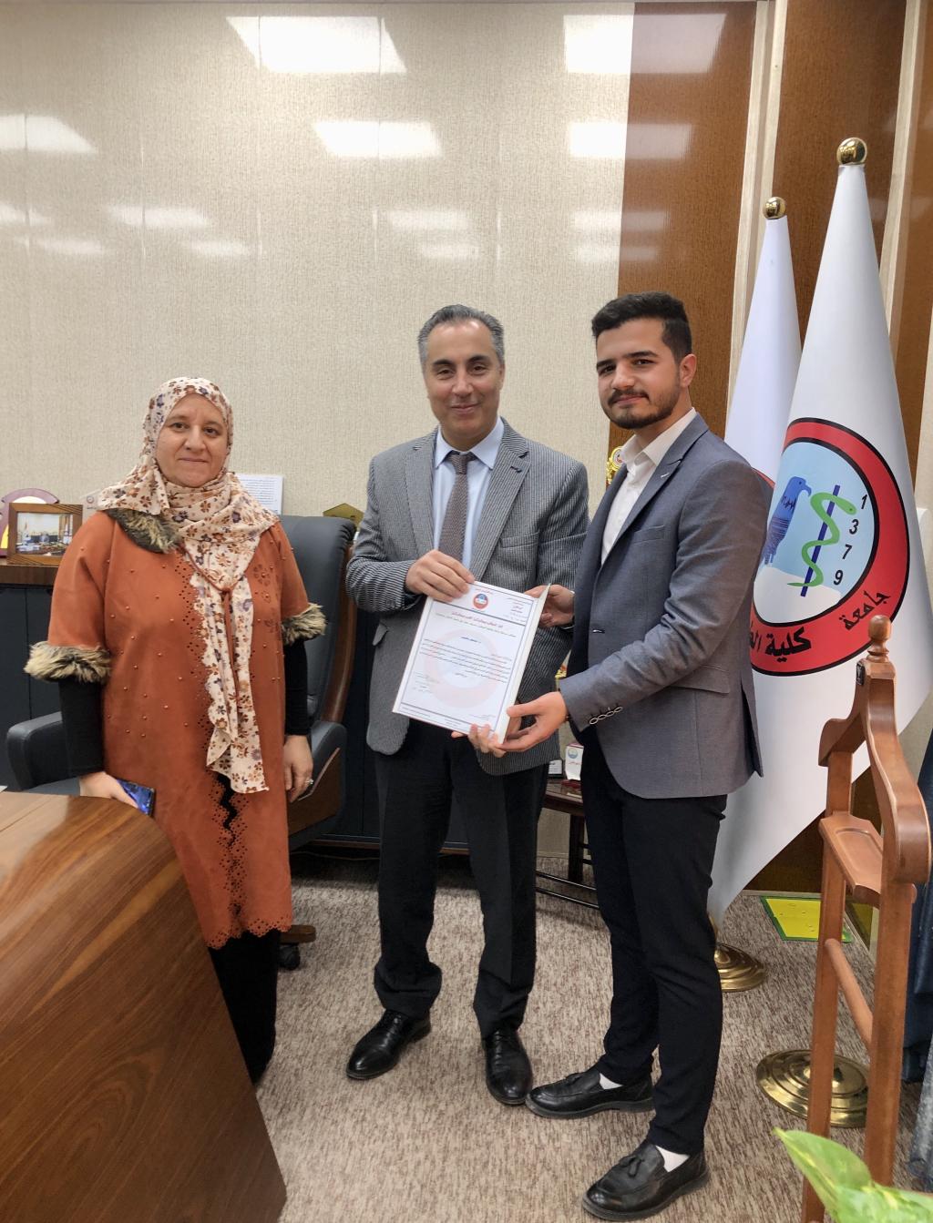 سيادة عميد كلية الطب الأستاذ الدكتور باسل محمد نذير سعيد المحترم يكرم اليوم الاحد الخامس من اذار 2023 طالب المرحلة الرابعة (عبد الرحمن اكرم )لتعاونه الدائم مع شعبة الاعلام والعلاقات العامة و جهوده المميزة في نشاطات الكلية .تأتي هذه الالتفاتة من سيادة العميد وفق سياسة العمادة الداعمة لمواهب الطلاب المنوعة العلمية والادبية والفنية .