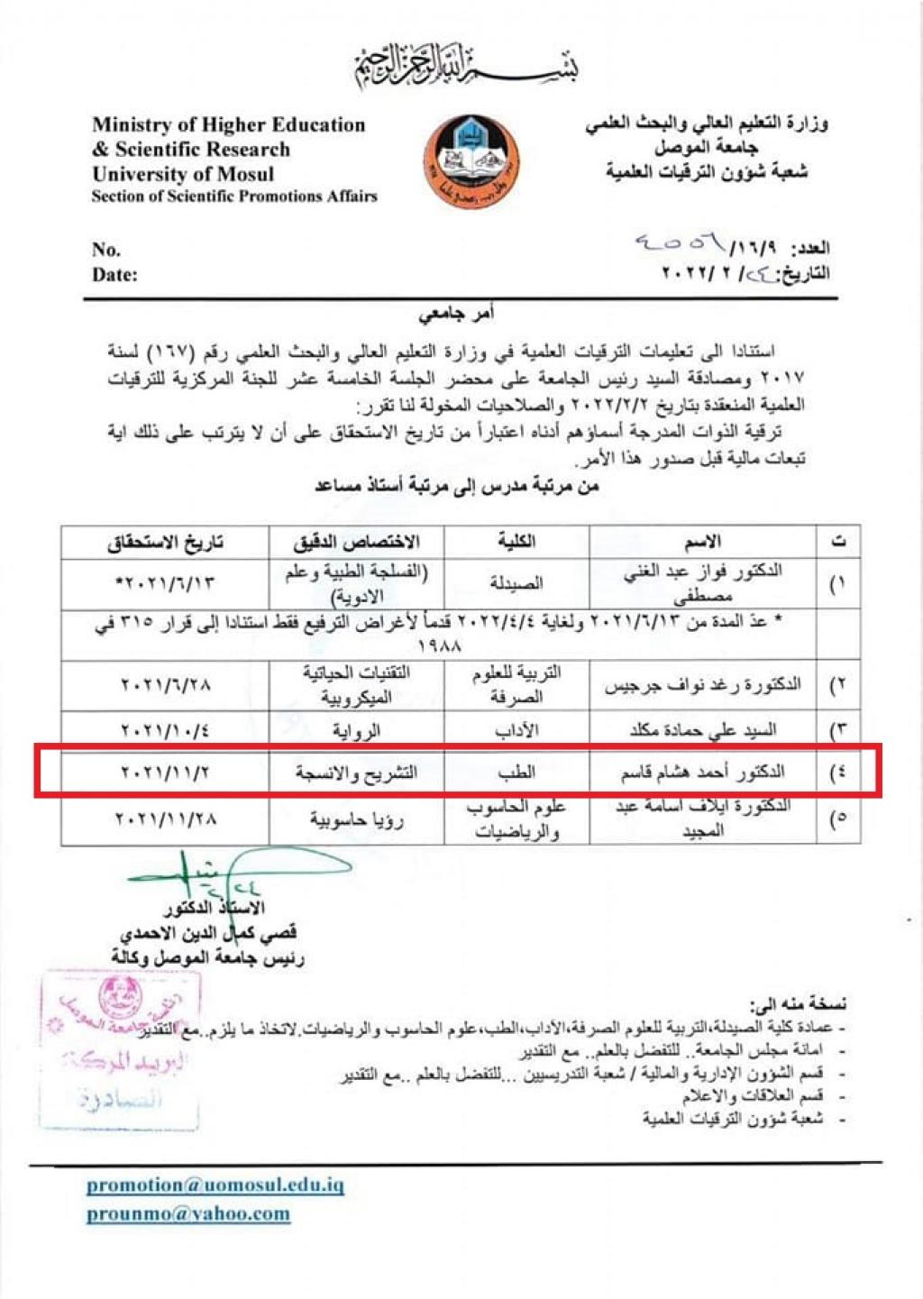 عمادة كلية الطب جامعة الموصل تبارك تدريسي فرع التشريح الدكتور أحمد هشام قاسم لمناسبة ترقيته إلى مرتبة أستاذ مساعد