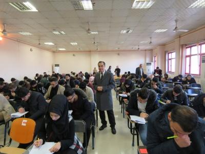 تفقّد السيد عميد كلية الطب جامعة الموصل الأستاذ الدكتور باسل محمد نذير سعيد، والسيد معاون العميد للشؤون العلمية الأستاذ المساعد الدكتور همام غانم ابراهيم القاعات الامتحانية لامتحانات نصف السنة للعام الدراسي 2018 – 2019، وذلك يوم الاثنين 21 كانون الثاني 2019. وتضمّن اليوم المذكور (الذي يعد اليوم الامتحاني الخامس) امتحان مادة التشريح (المرحلة الثانية)، ومادة الجراحة (المرحلة الرابعة). وشملت الجولة تفقد قاعات الشابندر والرشيد والرابع ومختبر التشريح ومدرج 3 كلية الصيدلة. وتشهد الامتحانات تنظيماً وسلاسةً جيدةً جداً، كون اللجنة الامتحانية تقوم بواجباتها على أكمل وأتمّ وجه، على الرغم من ضعف أو محدودية الإمكانات المتاحة، مع ما يقابلها من أعداد غفيرة وكبيرة جداً من الطلبة. هذا، وكانت رئيسة اللجنة الامتحانية في الكلية الأستاذ المساعد الدكتورة أروى محمود فوزي الصراف حاضرةً ومتواجدةً أثناء هذه الجولة التفقدية لسير الامتحانات.