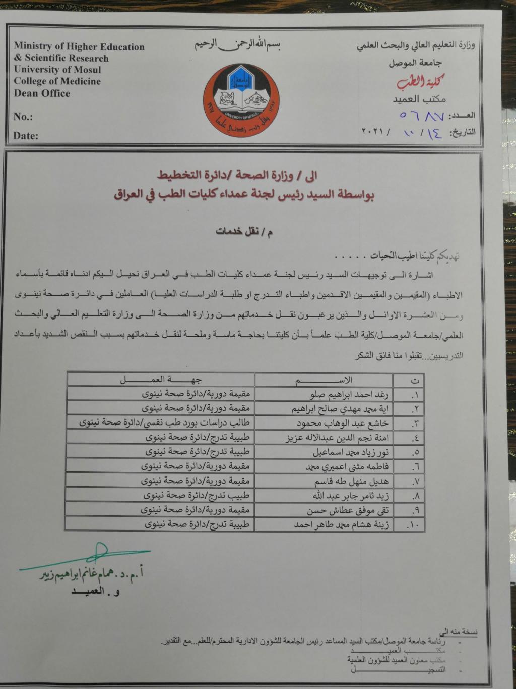 عمادة كلية الطب جامعة الموصل تجري مقابلة للعشرة الأوائل من خريجي الكلية للأعوام الخمس الأخيرة