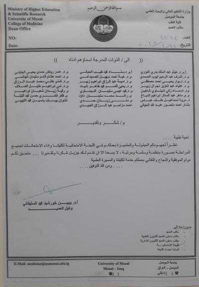 عمادة كلية الطب جامعة الموصل توجه كتاب شكر وتقدير إلى اللجنة الإمتحانية للكلية