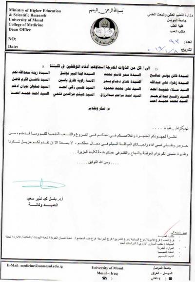 عمادة كلية الطب جامعة الموصل توجه كتاب شكر وتقدير إلى عدد من إداريي وفنيي الكلية