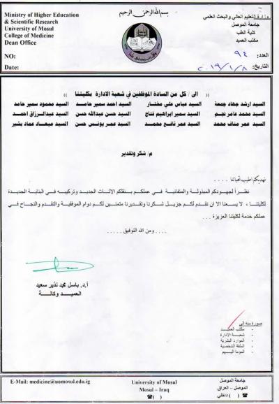 عمادة كلية الطب جامعة الموصل توجه كتاب شكر وتقدير إلى عدد من إداريي وفنيي الكلية