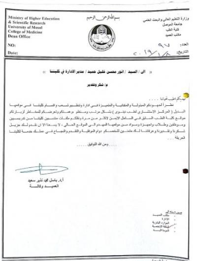 عمادة كلية الطب جامعة الموصل توجه كتاب شكر وتقدير إلى السيد أنور محسن الحمداني